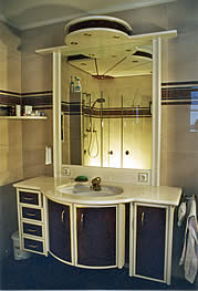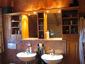Maßgenau an den Marmortisch angepasstes Möbelstück in massiver Erle, Oberfläche geölt